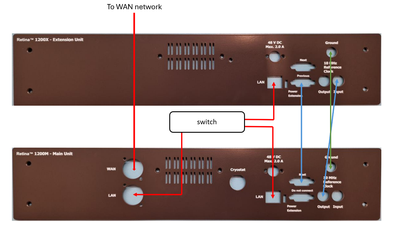 Connection scheme for multiple Retina units. The main unit is at the bottom of the image, and the extension unit at the top.¶